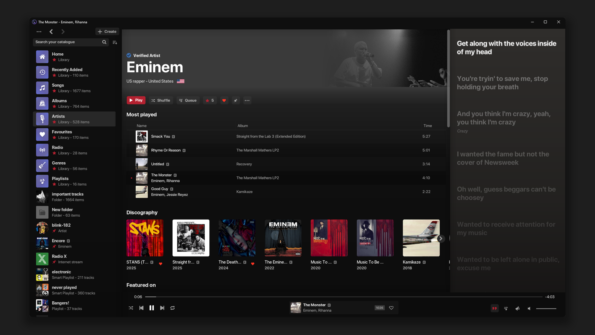 Artist pages will show the artist discography, the most played tracks from that artist, the overview, and more. It will also show you albums this artist is featured on. Here's Eminem's page for example: