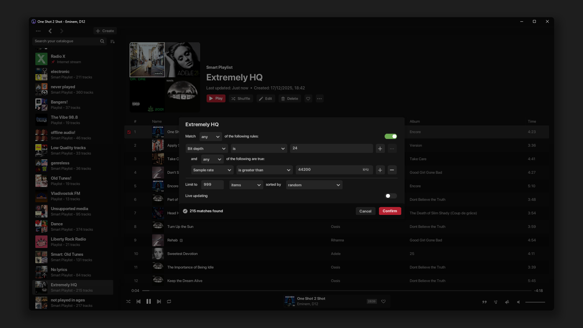 Create a Smart Playlist based on your filters using a familiar interface. These playlists will update and synchronise to your Jellyfin server automatically