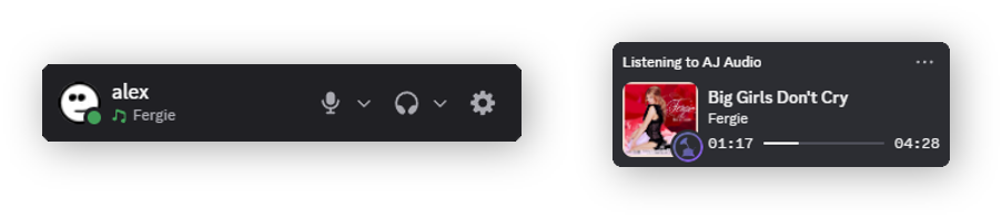 Integration with Discord Rich Presence is available with AJ Audio version 2.0.4 onwards. This allows you to show your friends what you're currently listening to. By default, this option is on.